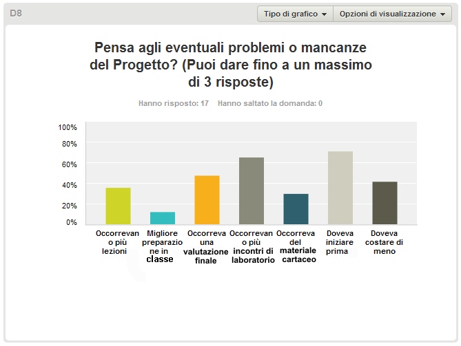 Il questionario di feedback sul Bioform è stato attivo dal 23/05/2013 al 9/06/2013. Hanno risposto 17 studenti su 24 studenti (pari al 70%) della popolazione invitata al compilare il questionario. Anche se totalmente hanno partecipato 42 studenti solo 24 ha seguito però più della metà delle ore di attività proposte.